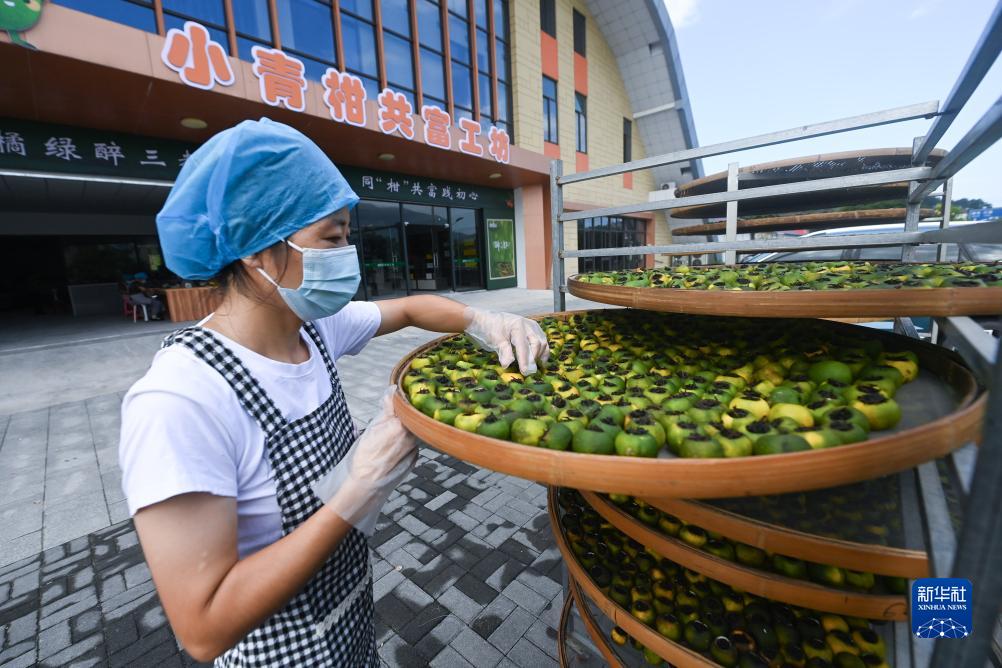 8月20日,在浙江省建德市三都鎮松口村的小青柑共富工坊,工人把青柑茶搬運至曬場進行晾曬。