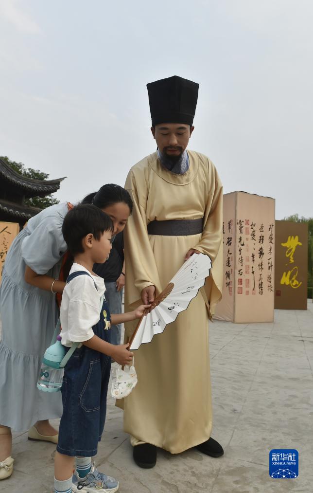 8月19日,身穿古裝的工作人員在中國翰園碑林景區與游人互動。