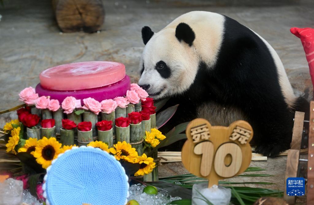 當日,位於海口市的海南熱帶野生動植物園為園內大熊貓“貢貢”和“舜舜”舉行10歲生日慶祝活動。工作人員用冰塊、竹筍、水果等製作生日大餐,為它們慶生。