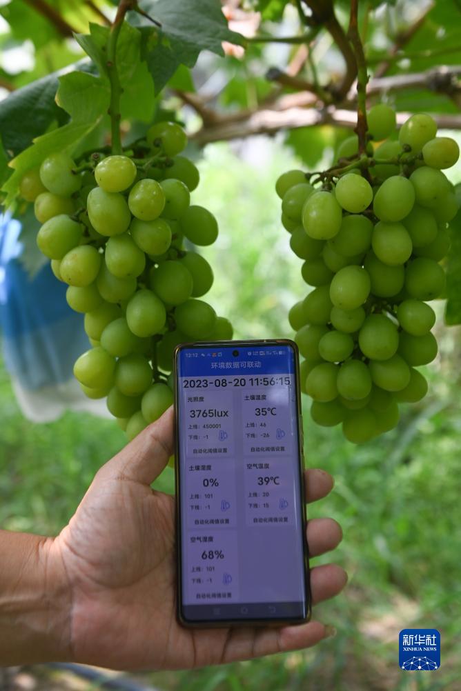 8月20日,在諸暨市姚江鎮浦西村純禾生態園內,種植戶何建華展示手機上實時顯示的葡萄園各類環境信息。