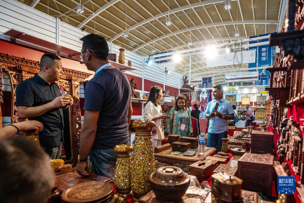 8月18日,參觀者在第七屆中國—南亞博覽會尼泊爾展區參觀、選購商品。