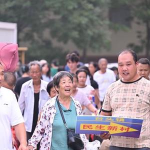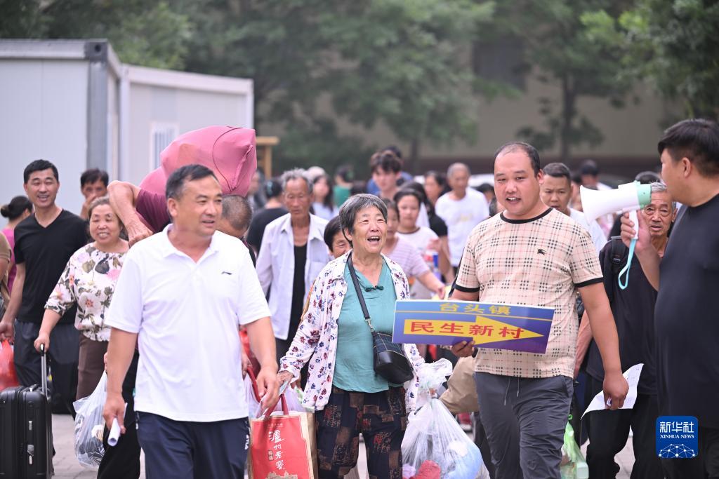 8月20日,在天津市西青區赤龍南街道一臨時安置點,村民準備乘車回家。
