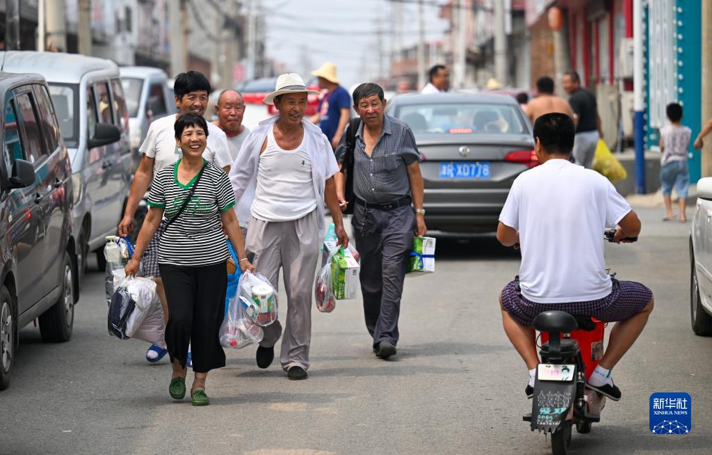 8月20日,在天津市靜海區&頭鎮,返村村民在街上相互問候。