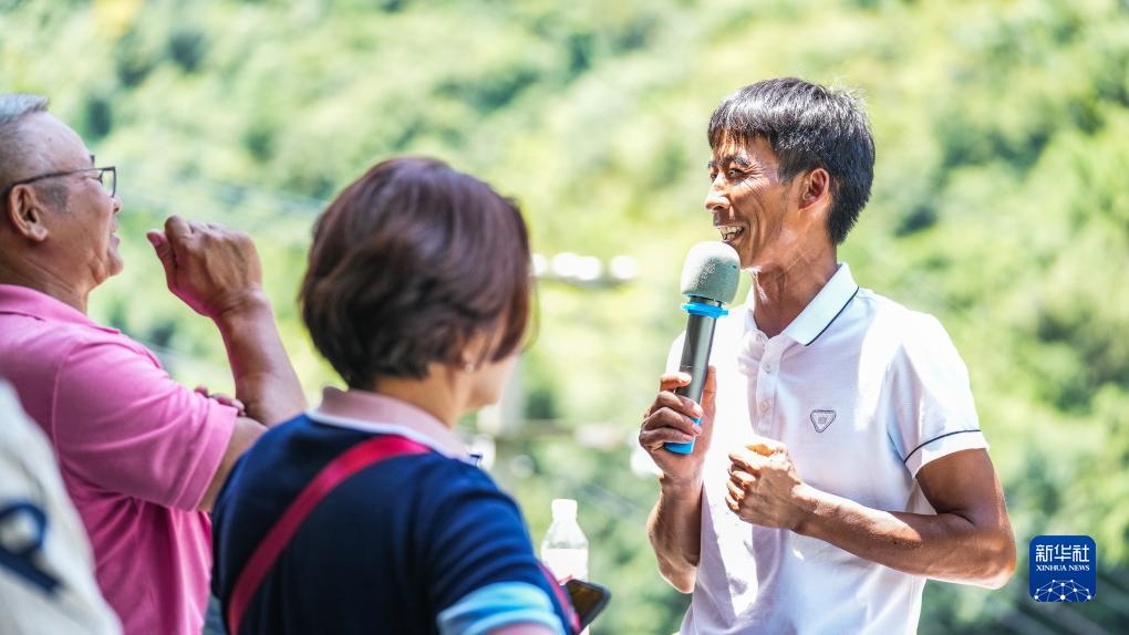 馬選軍在向外地游客介紹北盤江大橋和家鄉的變化(8月16日攝)。