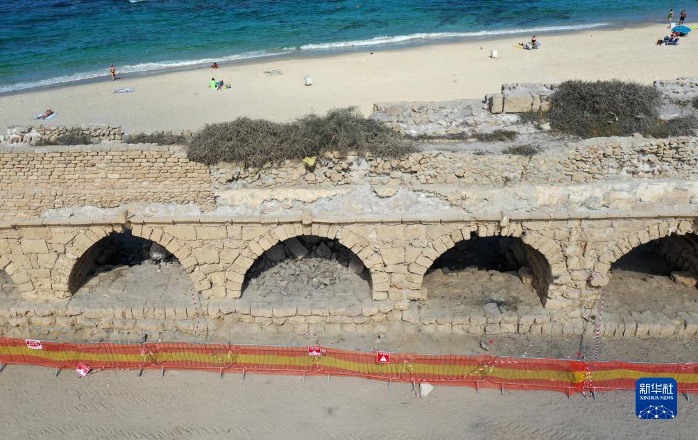 這是8月20日在以色列城市凱撒裏亞拍攝的古羅馬渡槽遺址(無人機照片)。