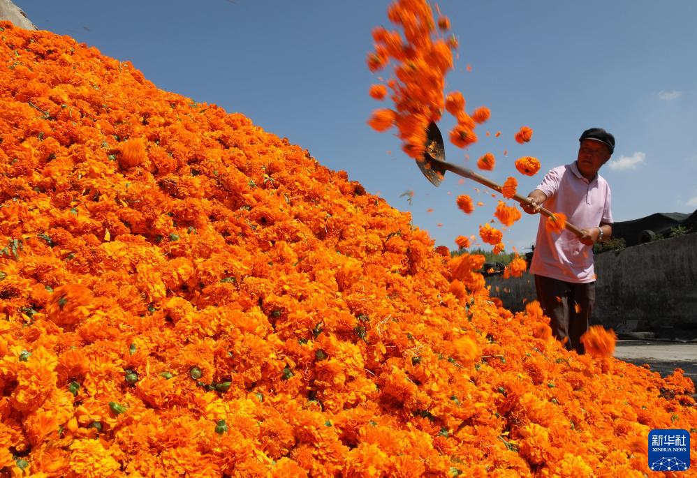 8月20日,在河北省平泉市平北鎮的萬壽菊花朵收儲基地,農民將剛剛采收的萬壽菊花朵進行集中收儲。