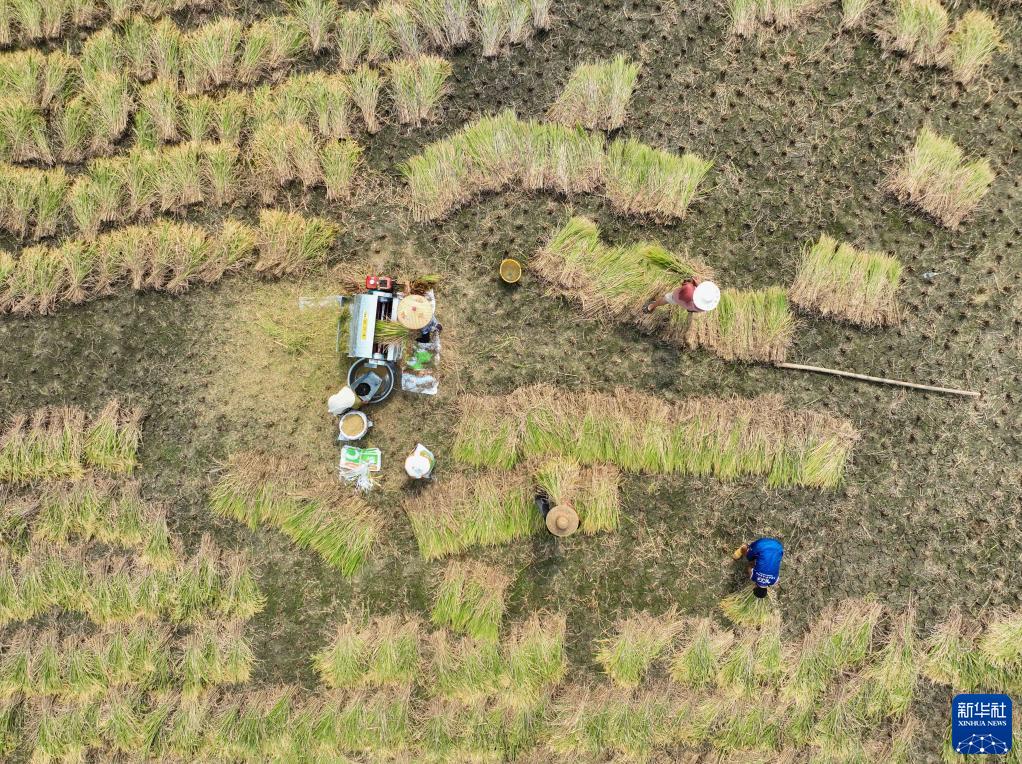8月20日,在湖南省永州市道縣清塘鎮廖家村,農民在收穫水稻(無人機照片)。