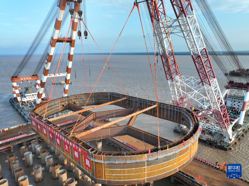 8月20日在江蘇省啟東市拍攝的崇啟公鐵長江大橋4號主墩首節鋼圍堰安裝現場(無人機照片)。