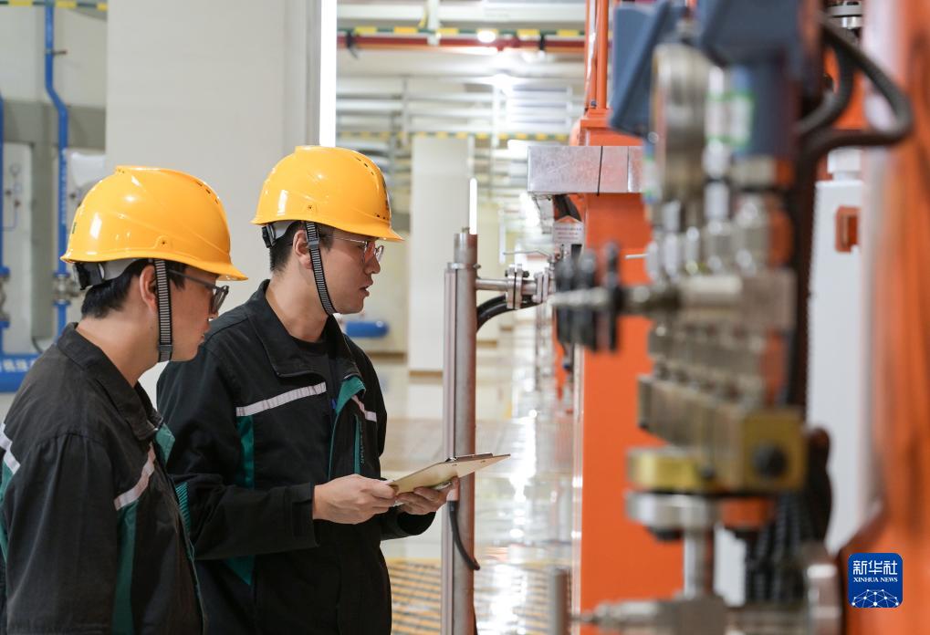 在河北承德的國網新源豐寧抽水蓄能電站地下廠房內,工作人員對設備進行巡檢(8月19日攝) 。