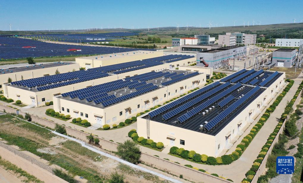 在河北張家口的國家風光儲輸示範工程內數排儲能廠房並列其中,這是風光儲輸系統中重要的電力存儲設備(8月18日攝,無人機照片)。