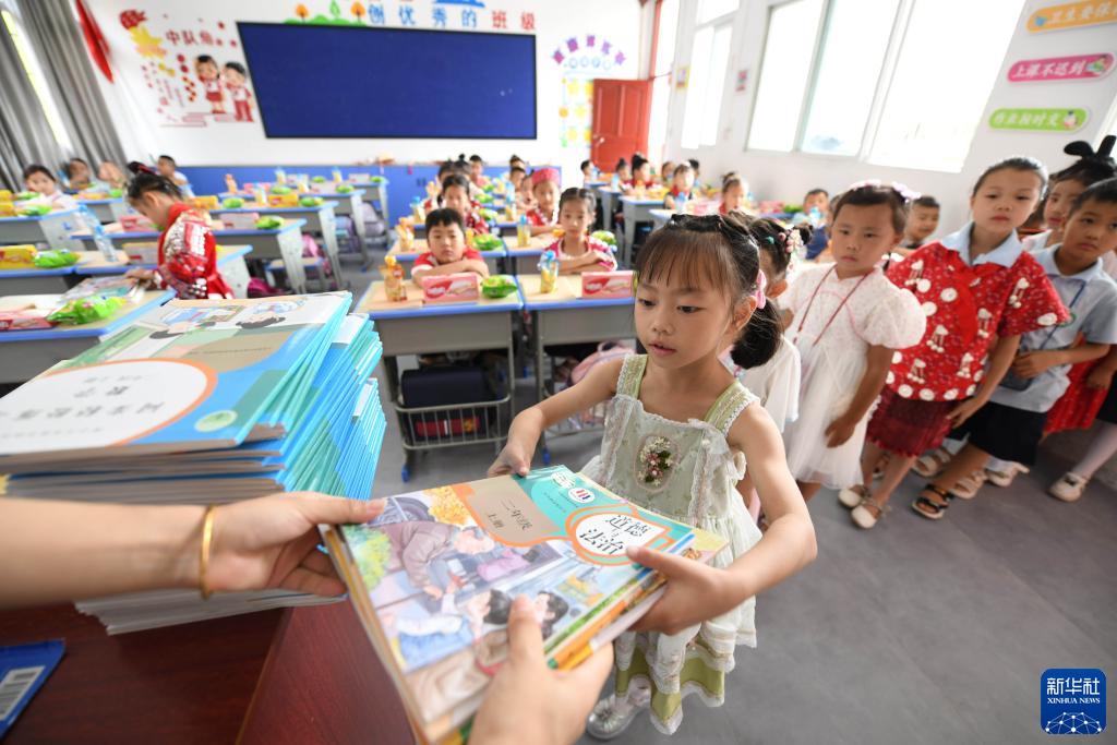 8月21日,學生在貴州省黔東南苗族侗族自治州黃平縣新州鎮中心小學領取新課本。