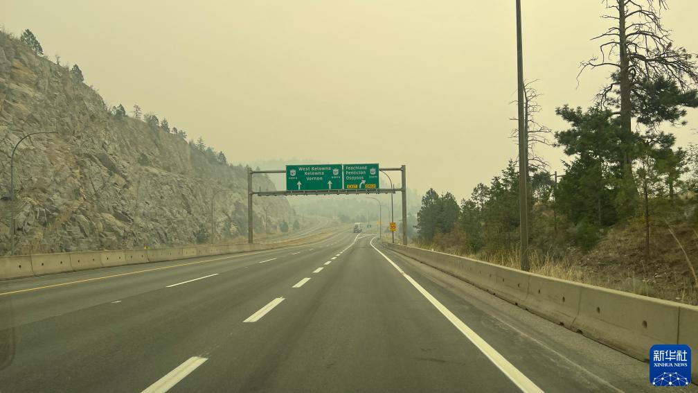 這是8月20日在加拿大基洛納附近拍攝的野火煙霾籠罩中的高速公路。
