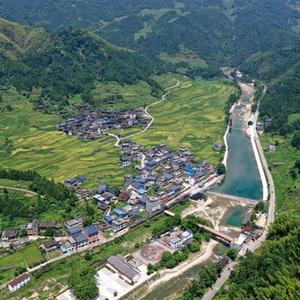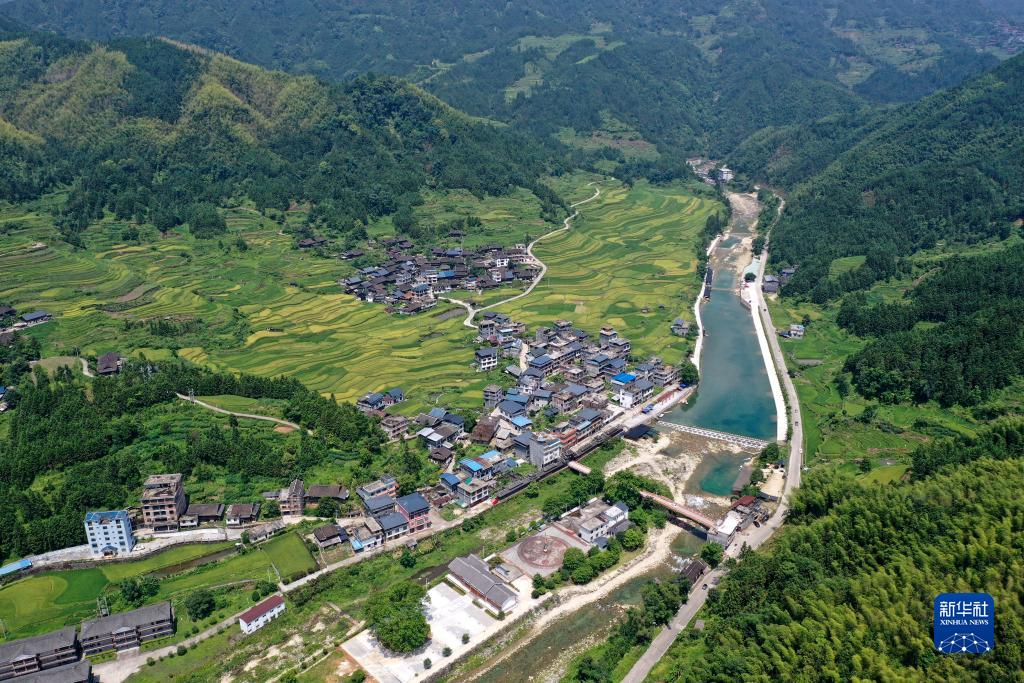 融水苗族自治縣香粉鄉雨卜村整治後的河道、村莊、旅游設施等(8月19日攝,無人機照片)。近年來,雨卜村充分利用粵桂協作幫扶資金,通過整治河道、修繕古建築等,發展鄉村旅游産業,打造鄉村旅游示範村。