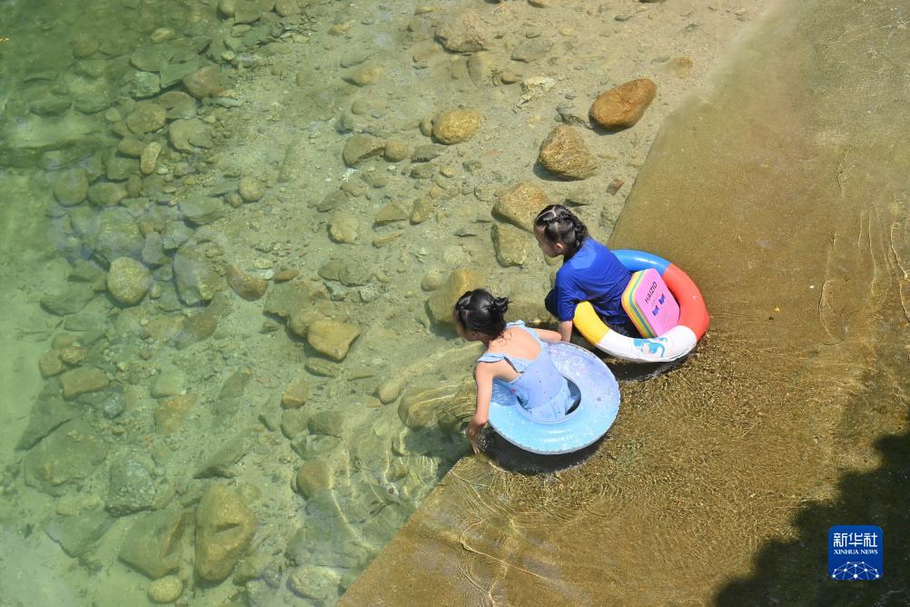 小朋友在融水苗族自治縣香粉鄉雨卜村戲水消暑(8月20日攝)。近年來,雨卜村充分利用粵桂協作幫扶資金,通過整治河道、修繕古建築等,發展鄉村旅游産業,打造鄉村旅游示範村。