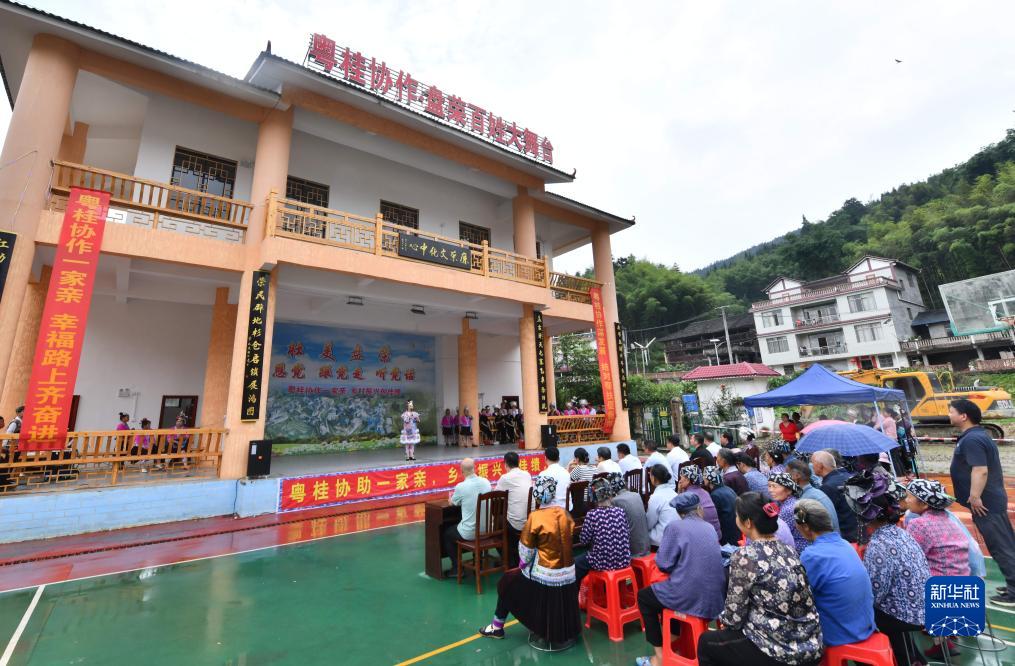 融水苗族自治縣懷寶鎮盤榮村村民在新建的粵桂協作文化戲&前觀看演出(5月26日攝)。近年來,融水縣投入粵桂協作幫扶資金,建成盤榮村百姓大舞&、農特産品展示中心等設施,打造産業融合發展示範村。