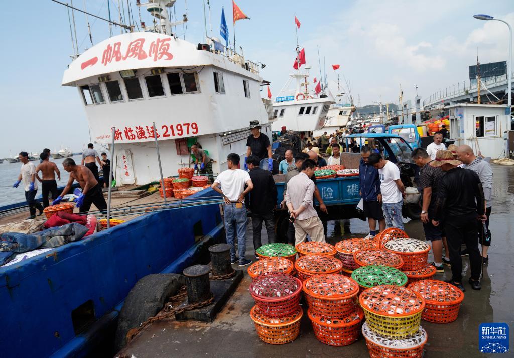 在浙江省舟山市,到港漁運船不時靠泊舟山國際水産城碼頭,帶來一筐筐新鮮梭子蟹。從出艙、轉運、分揀,再到打包、發貨,無數人為了梭子蟹而忙碌,舟山國際水産城新鮮水産交易火熱。