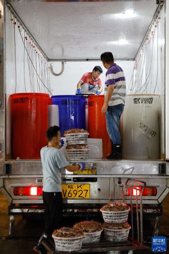 8月16日,在浙江省舟山市普陀區舟山國際水産城,工作人員將梭子蟹放在充氧水桶裏。新華社記者 劉夢琪 攝