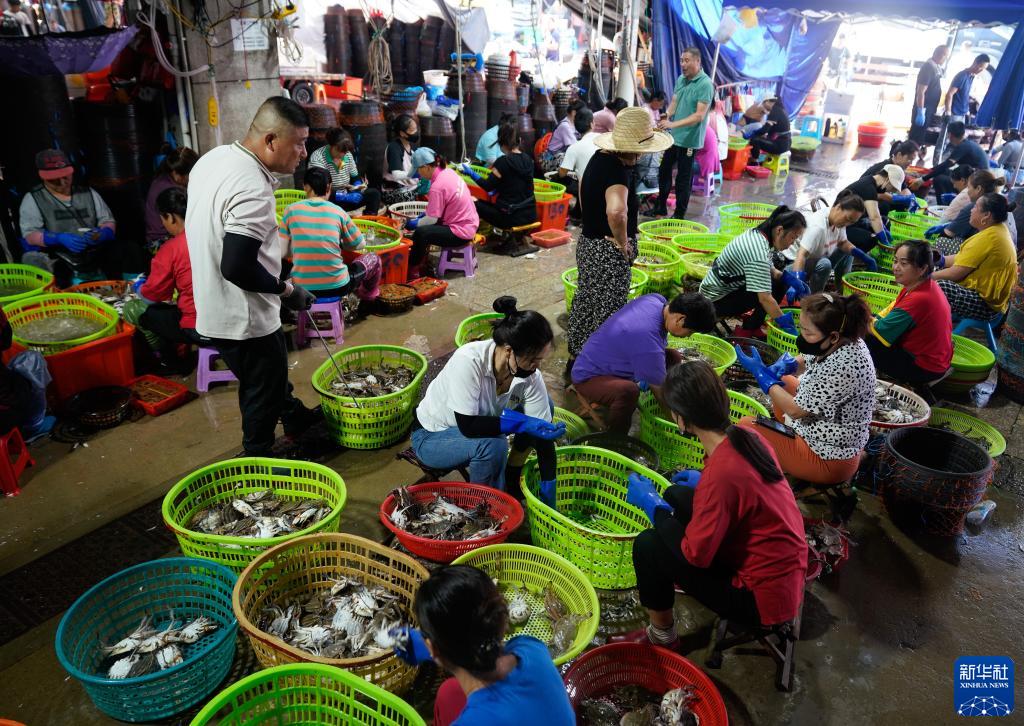 8月17日,在浙江省舟山市普陀區舟山國際水産城,工作人員按級分揀梭子蟹。新華社記者 韓傳號 攝