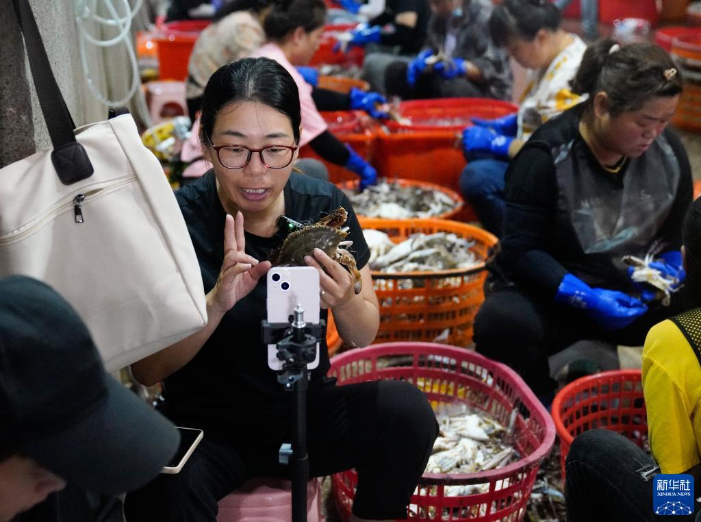8月17日,在浙江省舟山市普陀區舟山國際水産城商戶分揀現場,一名水産電商直播推介梭子蟹。新華社記者 韓傳號 攝