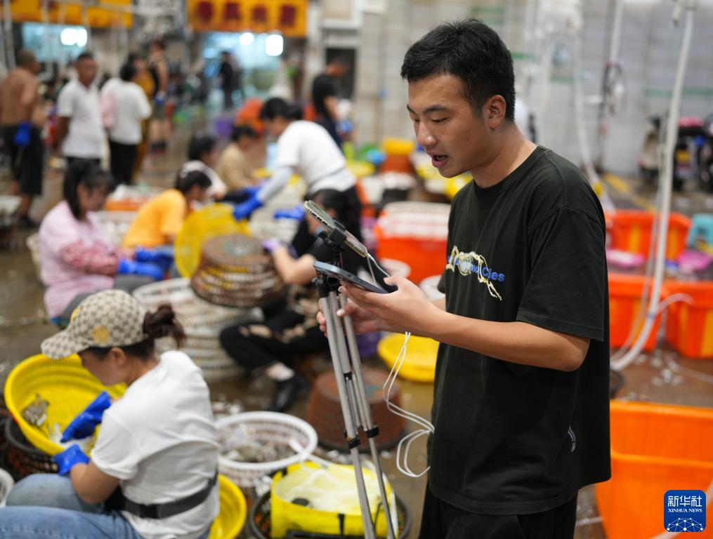 8月16日,一名主播在浙江省舟山市普陀區舟山國際水産城直播扎蟹場景。新華社記者 翁忻旸 攝