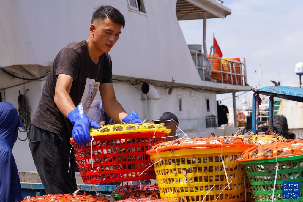 8月20日,船員在浙江省舟山市普陀區舟山國際水産城碼頭將一筐筐梭子蟹裝車。新華社發(鄒訓永 攝)