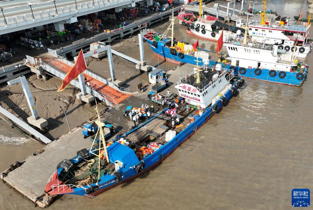 漁運船將新鮮梭子蟹運到浙江省舟山市普陀區舟山國際水産城碼頭(8月16日攝,無人機照片)。新華社發(胡錦 攝)