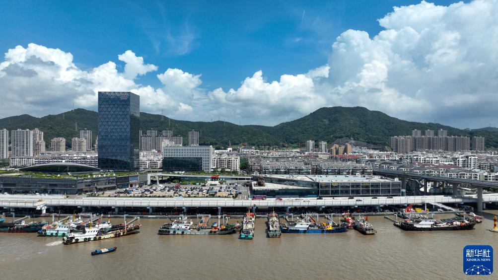 漁運船將新鮮梭子蟹運到浙江省舟山市普陀區舟山國際水産城碼頭(8月20日攝,無人機照片)。新華社發(鄒訓永 攝)