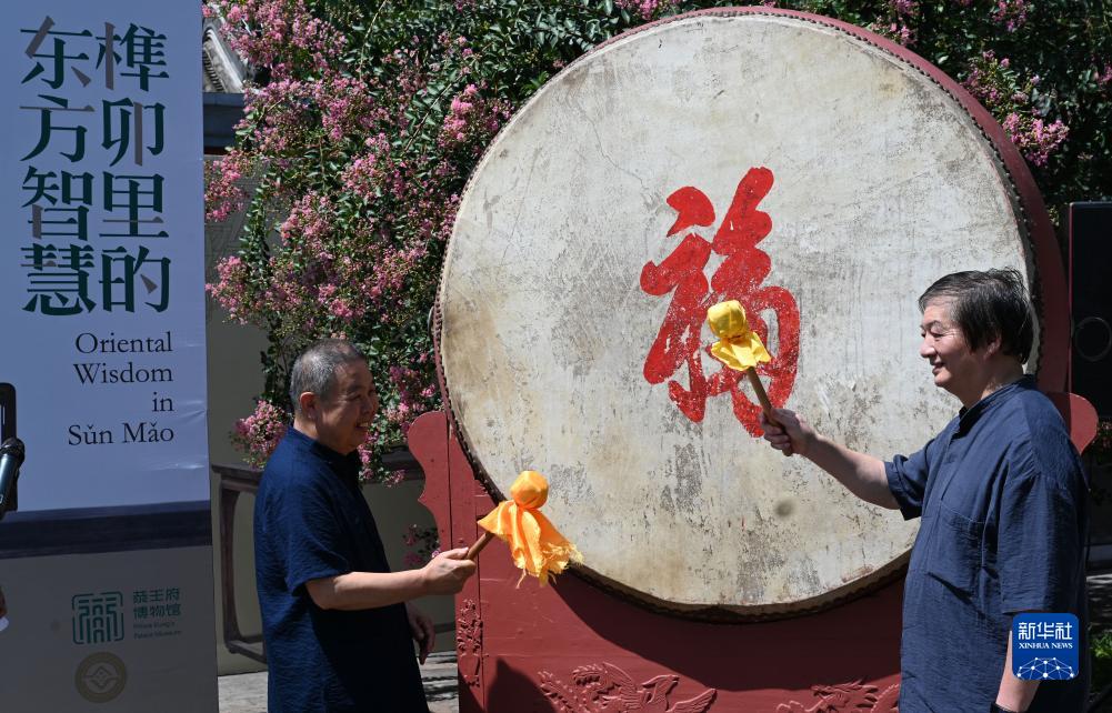 8月21日,京作硬木傢具製作技藝國家級代表性傳承人種桂友(左)、明式傢具製作技藝國家級代表性傳承人許建平共同為展覽擊鼓開幕。