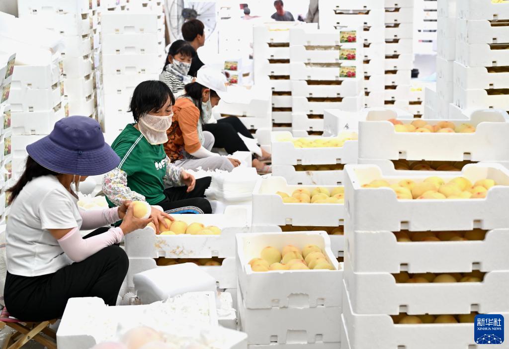 8月21日,唐山市豐潤區左家塢鎮一家鮮桃種植合作社的社員分揀包裝收穫的鮮桃。