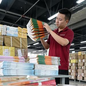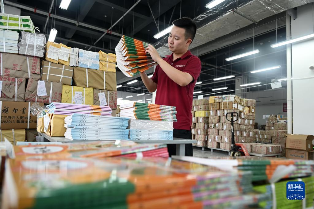8月21日,四川新華文軒內江市東興分公司工作人員在教材倉庫內清點整理新學期教材。
