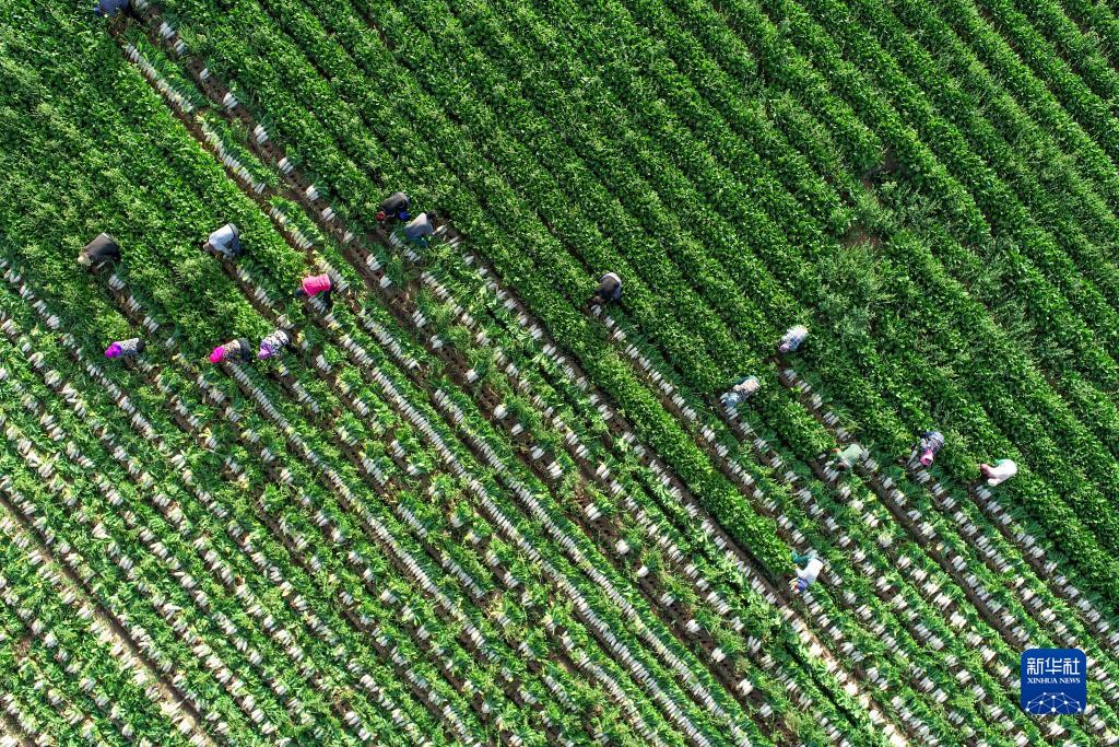8月21日,農牧民在鄂托克前旗城川鎮白蘿蔔種植基地收穫白蘿蔔(無人機照片)。