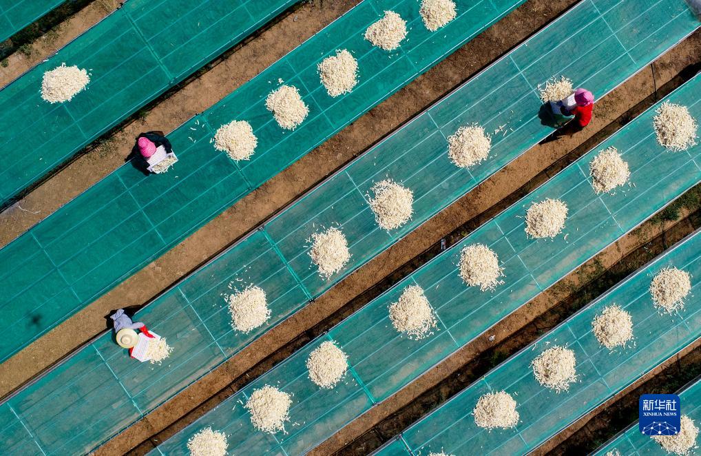 8月21日,工人在鄂托克前旗城川鎮一家副食品公司晾曬白蘿蔔條(無人機照片)。
