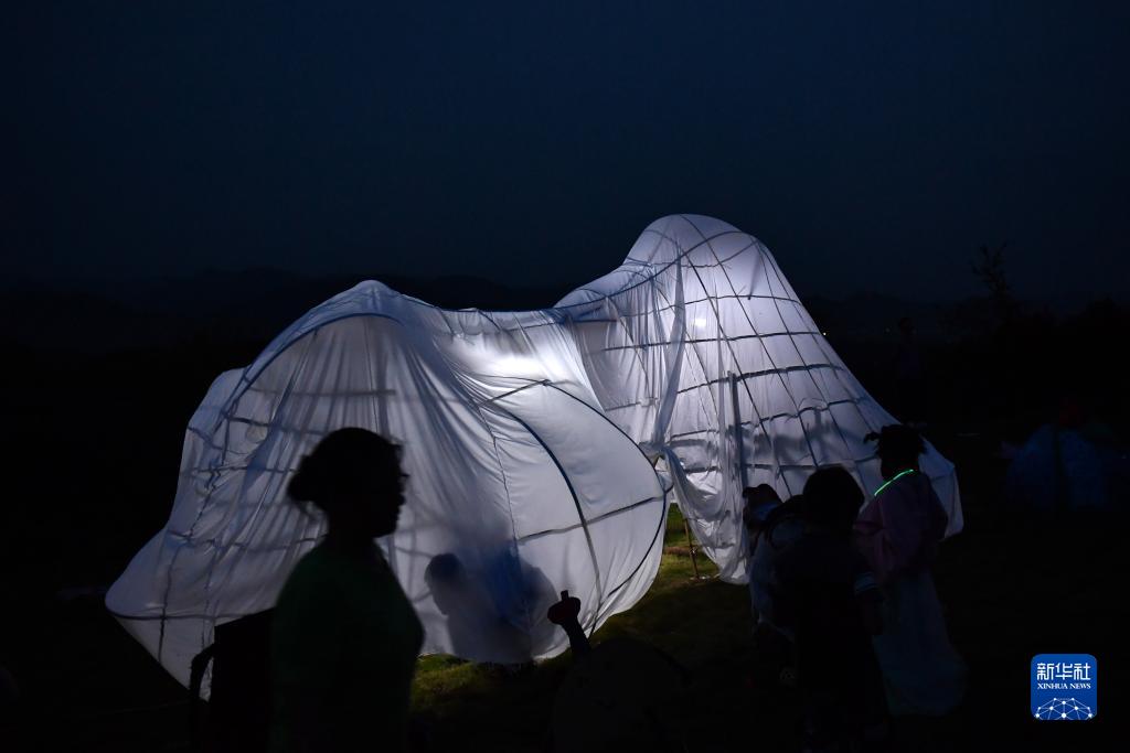 這是老師、志願者和孩子們用樹枝、竹篾搭建的裝置藝術作品“雲朵屋”(8月20日攝)。