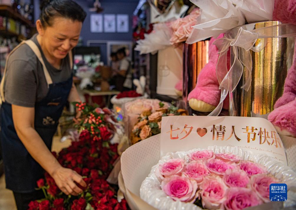 “七夕”將至,鮮花市場呈現俏銷勢頭,不少商家精心準備花卉産品,吸引顧客前來購買。
