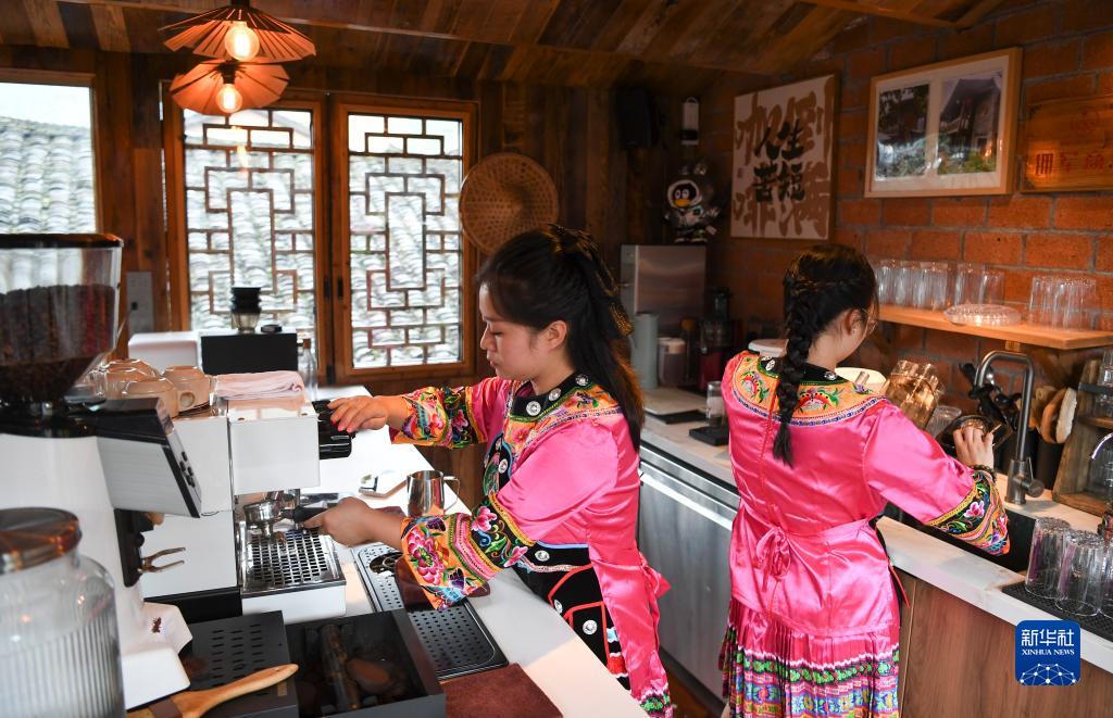 8月20日,酉陽縣花田鄉何家岩村一家咖啡廳的工作人員在準備飲品。
