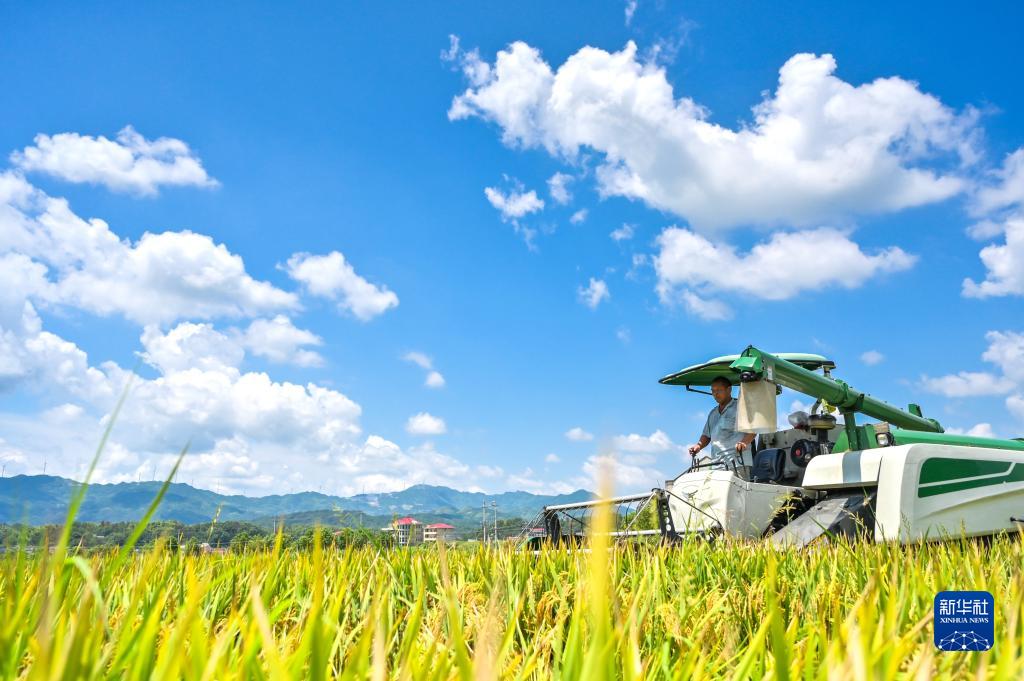 8月22日,在湖南省婁底市雙峰縣井字鎮花橋村,農民駕駛收割機收割稻穀。