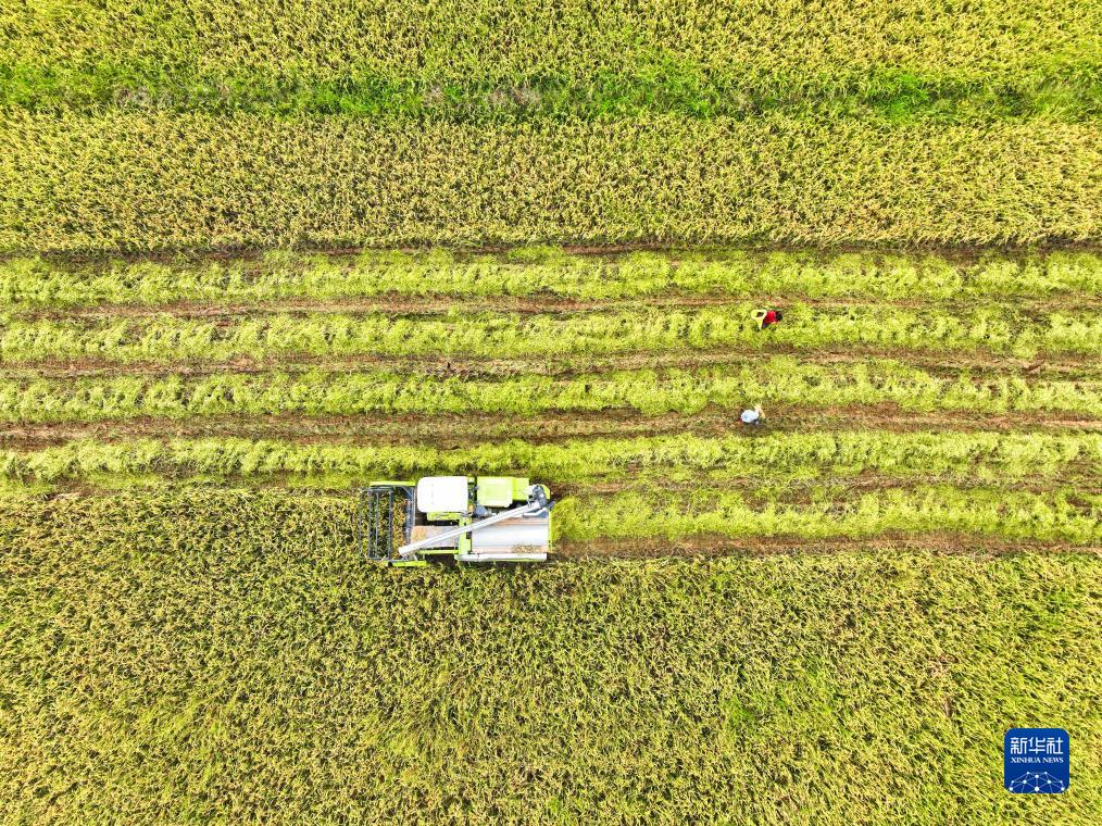 8月20日,湖南省常寧市板橋鎮西洞村農民駕駛農機在收穫水稻(無人機照片)。