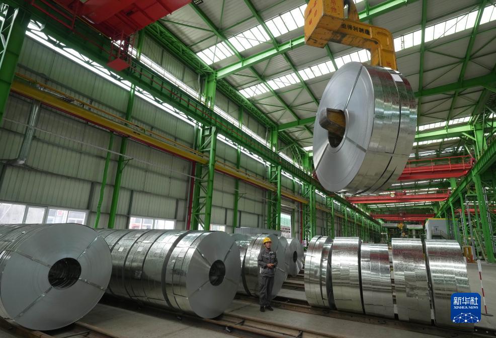 8月21日,工人在唐山市古冶區一家鋼鐵企業鍍鋅鋼板生産車間吊運成品鍍鋅鋼板。
