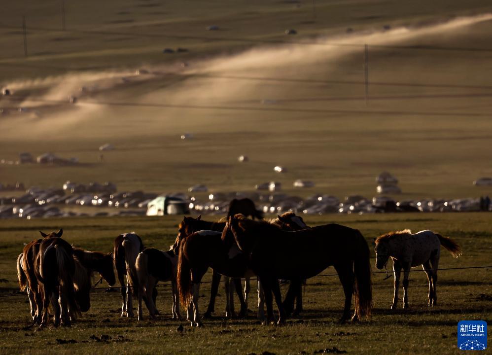 8月19日,在蒙古國泰吉山谷,馬群沐浴在夕陽裏。