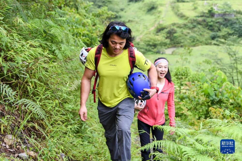 劉永邦(左)和肖婷在查看攀岩線路(2021年6月26日攝)。