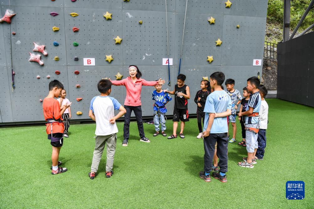 肖婷與前來學習攀岩的孩子互動交流(2021年6月26日攝)。