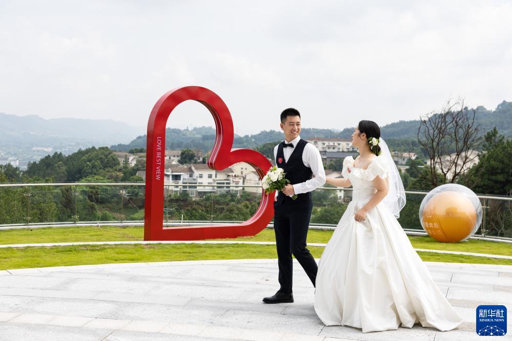 當日是七夕,來自四川省宜賓市三江新區33對新人在三江新區“三江之眼”舉辦了“為愛奔赴·幸福三江”主題集體婚禮。