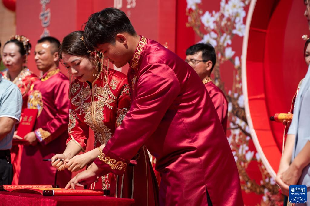 8月22日,新人在集體婚禮儀式現場簽訂婚書。