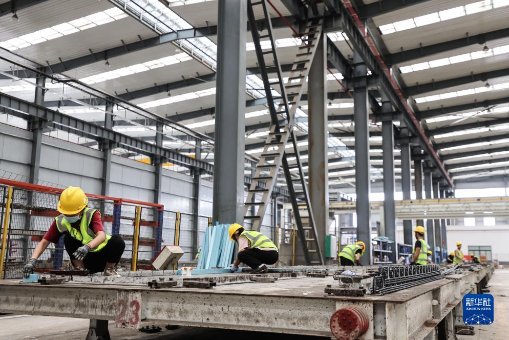 8月22日,海南定安縣新竹鎮華潤智築科技(定安)裝配式示範産業基地工人在捆紮鋼筋。