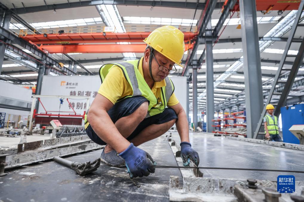 8月22日,海南定安縣新竹鎮華潤智築科技(定安)裝配式示範産業基地工人在佈置模具。