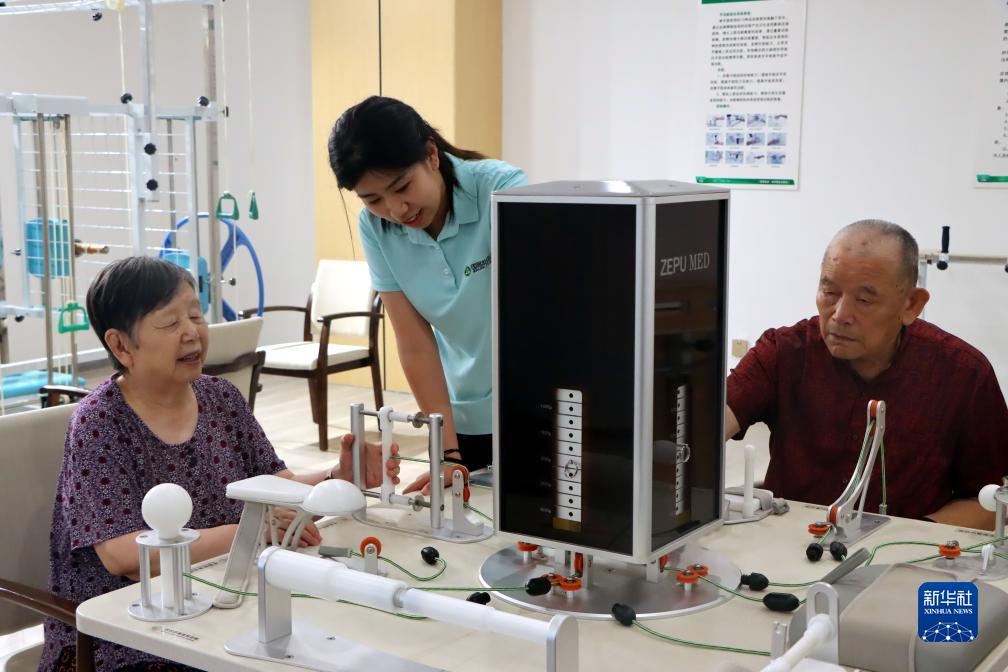8月21日,老人在位於山東省濱州市沾化區大高鎮國昌怡心園內的康復小屋做上肢康復訓練。