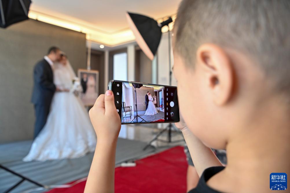 8月22日,小朋友用手機記錄爺爺奶奶的婚紗照拍攝過程。