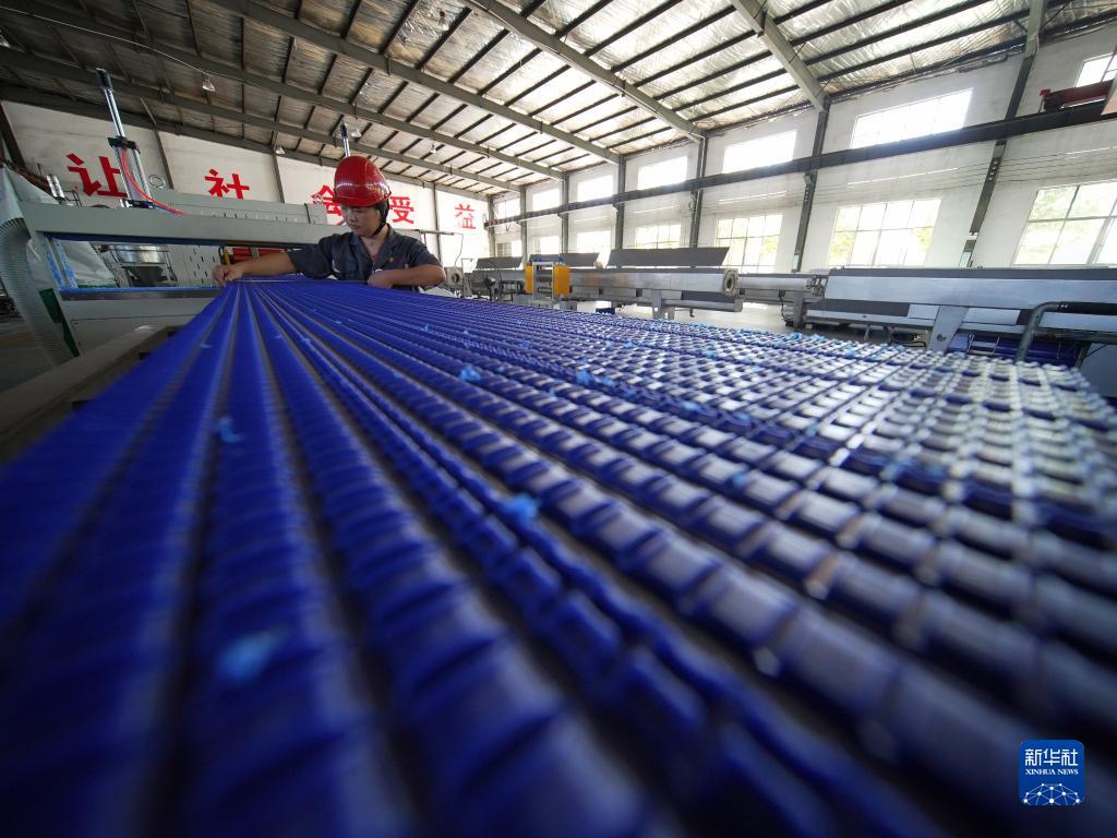 8月22日,工人在河北省滄州市孟村回族自治縣河北一塑管道製造有限責任公司海洋踏板生産車間進行海洋踏板産品下線測量。