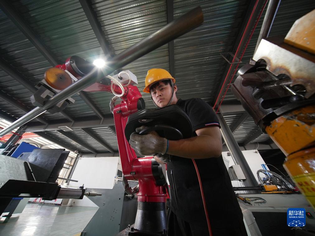8月22日,工人在河北省滄州市孟村回族自治縣河北龍錦管道裝備有限公司生産車間進行預製産品調試。