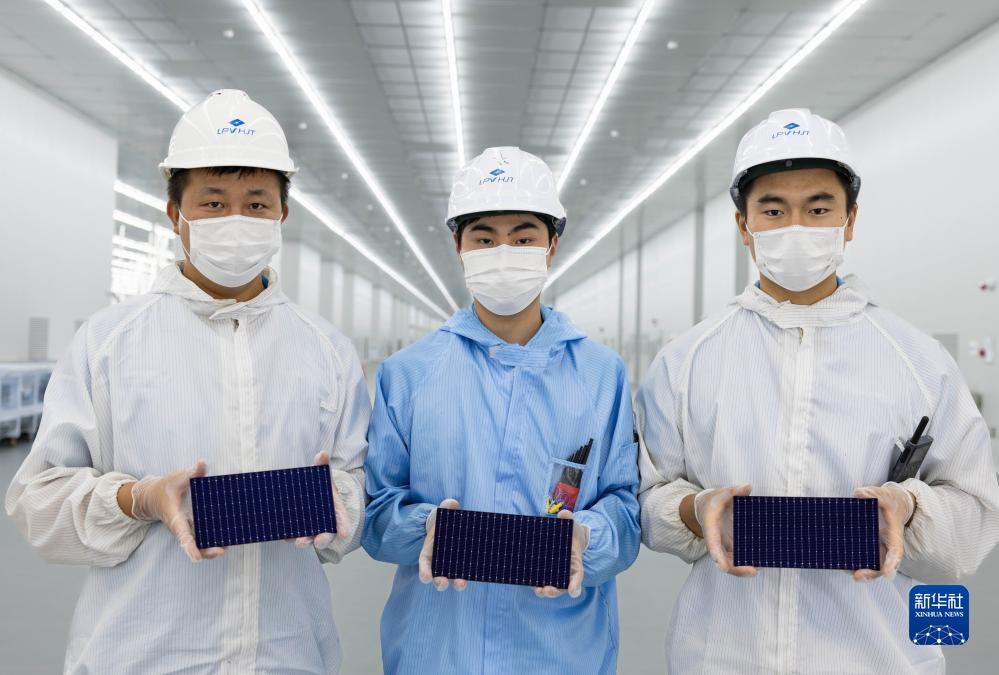 8月22日,在四川省丹棱縣經濟開發區的眉山璉升光伏8GW高效異質結電池項目電池車間,員工手捧第一批下線的異質結電池成品。